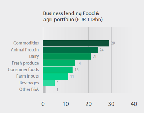 Binnen de agri- en foodsector staat de meeste financiering uit binnen de commoditysector. Ongeveer €29 miljard van de leningen binnen de portfolio staan uit binnen die tak. Op de tweede plaats staat nog altijd de dierlijke-proteïnesector. In totaal had de bank €24 miljard aan leningen in deze sector uitstaan.