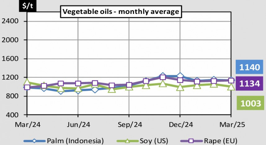 Volgens de Europese Commissie blijft palmolie de duurste plantaardige olie, met een prijsstijging van 4% op maandbasis en 21% op jaarbasis tot $1.140 per ton op 5 maart. Palmolie is 0,35% duurder dan raapzaadolie, 2,7% hoger dan zonnebloemolie en 13,32% duurder dan sojaolie.