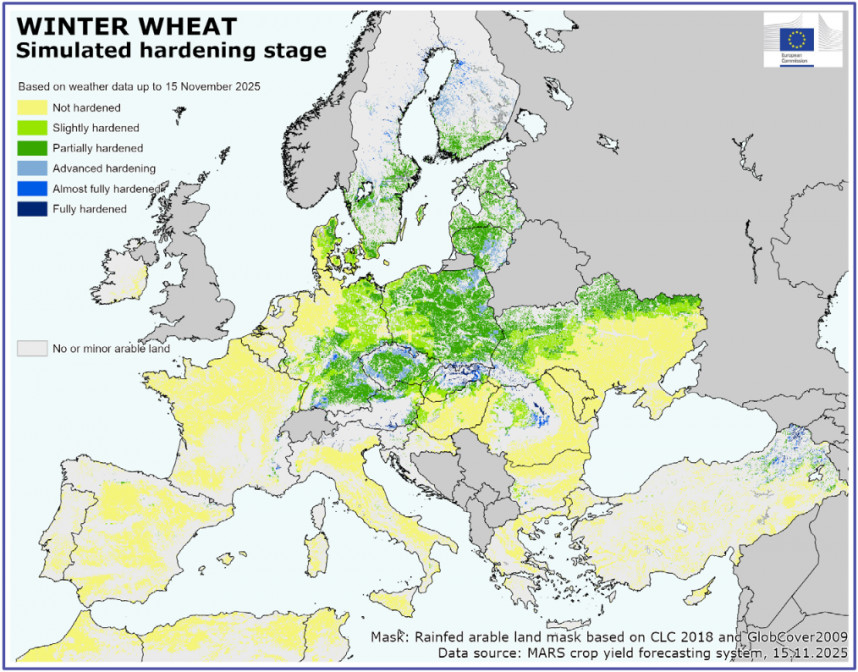 Door het relatief zachte weer deze herfst zijn de wintergranen vrij goed ontwikkeld. Daar zit wel een risico in. De wintergranen in grote delen van Europa zijn nog amper of niet winterhard. In de Benelux, Frankrijk en Duitsland is de meeste tarwe nog helemaal niet winterhard, terwijl vorig jaar rond deze tijd veel grotere delen al deels waren afgehard. Datzelfde gaat ook op voor een groot deel van de wintergranen in het zuidoosten van Europa. Dat is vooralsnog geen probleem, maar mocht het vrij plotseling serieus kouder worden dan is de kans op uitwinteren relatief groot.