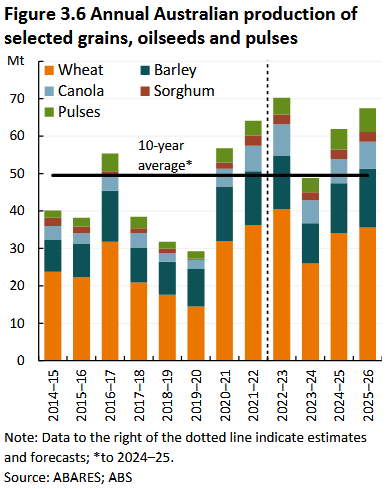 Australië stevent af op de op één na grootste oogst wintergewassen. Dat schrijft Abares (Australian Bureau of Agricultural and Resource Economics and Sciences, dat valt onder het Australische ministerie van Landbouw) in het Crop Report van december. De totale oogst wintergewassen wordt geraamd op 66,3 miljoen ton en zit daarmee 35% boven het tienjarig gemiddelde.