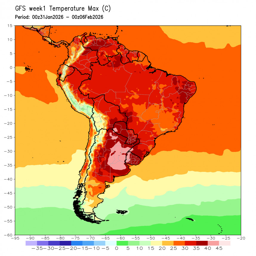 In Zuid-Amerika is het geen kou maar hitte dat voor problemen zorgt. In het noorden van Argentinië en Paraguay liggen temperaturen 2 tot 5 graden Celsius boven wat normaal is. Ook in het zuiden van Brazilië is het met temperaturen van ruim boven de 30 graden erg warm. Voor de Argentijnse pampa's wordt de komende twee weken regen voorspeld. Dat is gunstig voor de groei van maïs en soja. In het centrale deel van Brazilië wordt het volgens de weermodellen natter dan normaal. Voor de tweede teelt is dat gunstig, maar voor de soja – die daar ongeveer rijp is – kan het volgens sommige lokale bronnen beter droog blijven.