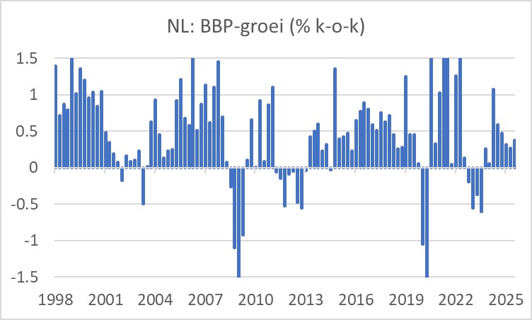 De Nederlandse economie is in het derde kwartaal met 0,4% gegroeid ten opzichte van het tweede kwartaal. Vooral de export en de overheidsconsumptie droegen positief bij. Ook de consumentenbestedingen groeiden, maar de investeringen daalden.