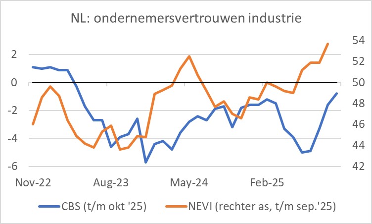 Het vertrouwen van Nederlandse industriële ondernemers nam in oktober verder toe volgens de maatstaf van het CBS. De index verbeterde van -1,6 in september tot -0,8. Dat was het beste cijfer sinds april 2023. Maandag volgt de Nevi met de inkoopmanagersindex voor oktober.