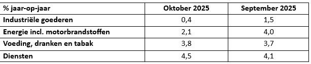 Onze inflatie is in oktober iets gedaald: van 3,3% in september naar 3,1%. Dat is welkom, maar blijft te hoog. Bij de 'snelle raming' publiceert het CBS naast het totale cijfer slechts voor vier componenten de gegevens. Van die details word ik nog niet direct erg vrolijk. De prijsstijging bij industriële goederen en energie nam fors af, maar bij de 'dagelijkse boodschappen' (voeding etc.) en bij diensten ging het de andere kant op. Diensten maken ongeveer de helft uit van de inflatiemand. De stijging van 4,5% was de hoogste in zes maanden tijd. Volgens Peter Hein van Mulligen van het CBS werden vooral vliegtickets duurder. Zulke details zijn echter nog niet publiekelijk beschikbaar. Als de versnelling van de inflatie bij diensten vooral aan vliegtickets ligt, dan is dat waarschijnlijk tijdelijk. Maar we moeten ons realiseren dat diensten in het algemeen arbeidsintensief zijn en dat de ontwikkeling van de loonkosten een belangrijke factor is achter de diensteninflatie.