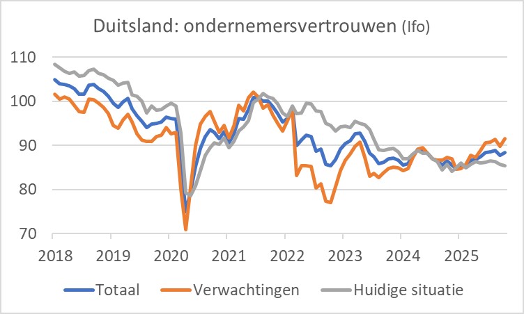 In weerwil van deze berichten werden Duitse ondernemers in oktober iets positiever over de toekomst. De verwachtingen-component van de Ifo-index steeg naar het hoogste niveau sinds begin 2022. Hoop doet leven, maar de beoordeling van de huidige situatie viel juist minder positief uit.