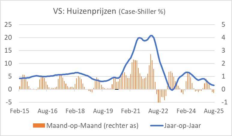 Toch zijn er ook wel enkele echt zwakke plekken te constateren. Volgens de Case-Shiller-maatstaf zijn de huizenprijzen in augustus voor de tweede maand op rij gedaald. Als die daling de komende maanden doorzet, kan dat reden zijn voor de Fed om de rente toch verder te verlagen.