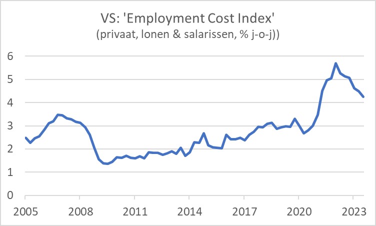 Tijdens de persconferentie werd uitgebreid over de ontwikkeling van de lonen gesproken. Net als bij ons stijgen de lonen momenteel nog in een tempo dat hoger ligt dan verenigbaar is met de inflatiedoelstelling van de Fed. De zogeheten Employment Cost Index is een brede indicator van de ontwikkeling van de loonkosten. In het vierde kwartaal waren die 4,2% hoger dan een jaar eerder. Ten opzichte van het derde kwartaal bedroeg de stijging 0,9%. Dat is nog steeds hoger dan verenigbaar met 2% inflatie op langere termijn, maar het was de laagste kwartaalstijging sinds het tweede kwartaal van 2021. Met andere woorden, de stijging van de loonkosten matigt zich.