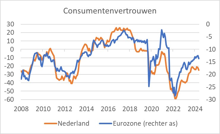 Het Nederlandse consumentenvertrouwen is opmerkelijk zwak, zowel in vergelijk met de consumptieve bestedingen als in vergelijk met het producentenvertrouwen en zelfs in vergelijk met het consumentenvertrouwen in de rest van de eurozone. Maar goed, je kunt beter een laag vertrouwen en stevige groei van de uitgaven hebben dan andersom.