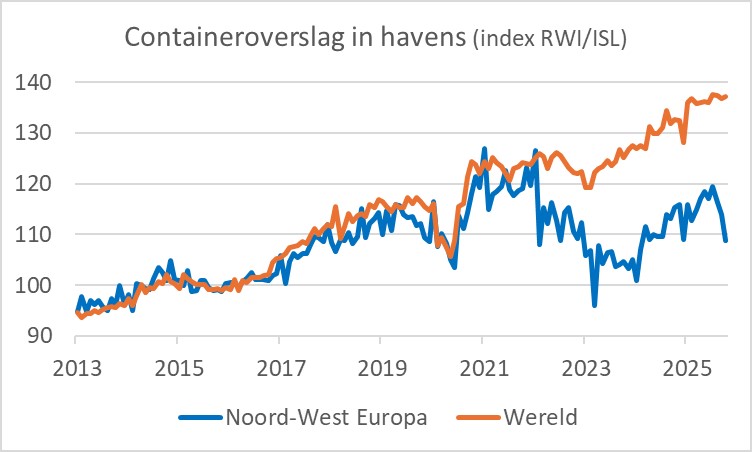 Twee Duitse onderzoeksinstituten produceren maandelijks cijfers omtrent de overslag van containers in havens. Het zijn het Leibniz-Institut für Wirtschaftsforschung (RWI) en het Institut für Seeverkehrswirtschaft und Logistik (ISL). Ze houden reeksen bij over een veelheid van havens over de hele wereld. De nieuwste data hebben betrekking op oktober. Ik volg deze cijfers al jaren, maar kan me niet herinneren wanneer ik ze voor het laatst opnam in dit wekelijkse commentaar. Vanwege de meest recente, opmerkelijke ontwikkeling in deze gegevens nu dus wel. Er zit een zekere volatiliteit in de cijfers. We moeten daarom niet te snel conclusies trekken, maar wat zich de laatste maanden aftekent, ziet er onheilspellend uit voor Europa.