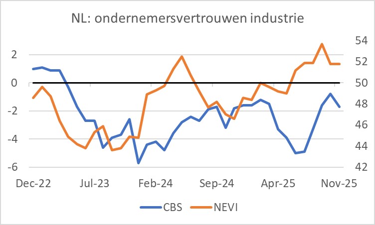 Dat voorkomt niet dat Nederlandse industriële ondernemers best positief zijn. De inkoopmanagersindex van de NEVI was in november onveranderd op 51,8. Die 51,8 is weliswaar iets lager dan in september, maar alleszins redelijk. Iets vergelijkbaars geldt voor de vertrouwensindex van het CBS. Die daalde iets in november, maar noteert ruim boven het gemiddelde van de afgelopen twee jaar.