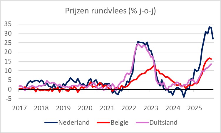 Het CBS heeft de details bekendgemaakt over onze inflatiecijfers over november. We wisten al dat die is uitgekomen op 2,9% tegen 3,1% in oktober. Al tijden kijk ik met verbazing naar sommige details. Neem de prijzen van rundvlees. Die stijgen al enige tijd zo spectaculair dat mijn dochter heeft besloten geen rundvlees op het menu van haar bruiloft te zetten. In Nederland stijgt de prijs bovendien veel harder dan in landen om ons heen (de bruiloft is overigens in Ierland, waar de prijsstijging tussen die in Nederland enerzijds en Duitsland en België anderzijds in ligt).