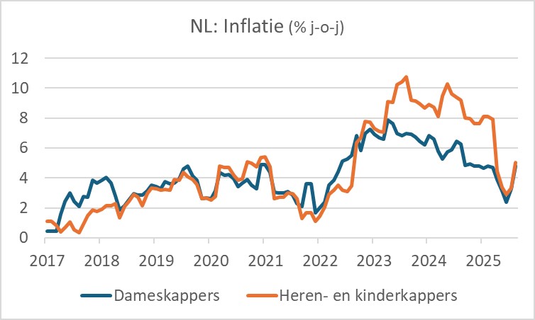 Ik volg ook de tarieven van kappers op de voet. Niet vanwege ijdelheid, maar omdat ik nu eenmaal een nerd ben die het leuk vindt om naar de details te kijken. De diensten die kappers leveren zijn zeer arbeidsintensief. Daar zie je dus waarschijnlijk snel de invloed van de loonontwikkeling. Dat was schrikken in november. De prijsstijging versnelde van 3,3% naar 4,8% voor dameskappers en 5,0% voor heren- en kinderkappers.