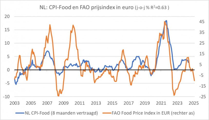 Waar gaat het nu heen met onze inflatie? Ik benader die vraag het liefst vanuit de componenten voeding, energie, industriële goederen en diensten. Voeding maakt circa 15% uit van het inflatiemandje. De prijsstijging van voeding (exclusief dranken en tabak) vertraagde van 3,6% in oktober tot 2,8% in november. Onze prijzen voor voeding volgen de wereldmarktprijzen (in euro) met een behoorlijke vertraging, al is de relatie zeker niet een-op-een. Het volgende plaatje suggereert dat de stijging van onze voedselprijzen de komende tijd zal matigen.