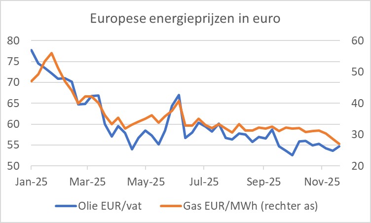 De industriële goederen maken zo'n 25% uit van het inflatiemandje. Daar is de prijsstijging al erg laag of zelfs negatief, zoals we zagen bij witgoed. In november lagen de prijzen voor deze categorie 0,5% hoger dan een jaar eerder. In oktober was het 0,4%. Ik veronderstel dat in dat beeld niet veel verandering komt.
