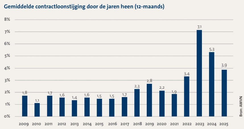 Diensten, tenslotte, maken ongeveer de helft van de inflatiemand uit. Daar was de prijsstijging verminderd van 4,3% in oktober naar 4,1% in november. Veel diensten zijn arbeidsintensief en reageren dus op de loonstijging. Volgens de AWVN zijn in nieuw afgesloten cao's de lonen dit jaar met 3,9% gestegen. Dat is minder dan in de twee voorafgaande jaren, maar nog duidelijk hoger dan voor de pandemie. Het wekt dan ook geen verbazing dat de AWVN, samen met VNO-NCW en MKB-Nederland pleit voor loonmatiging. Of daar naar wordt geluisterd zal mede afhangen van de onderhandelingskracht van de vakbonden in een tijd van arbeidsschaarste.