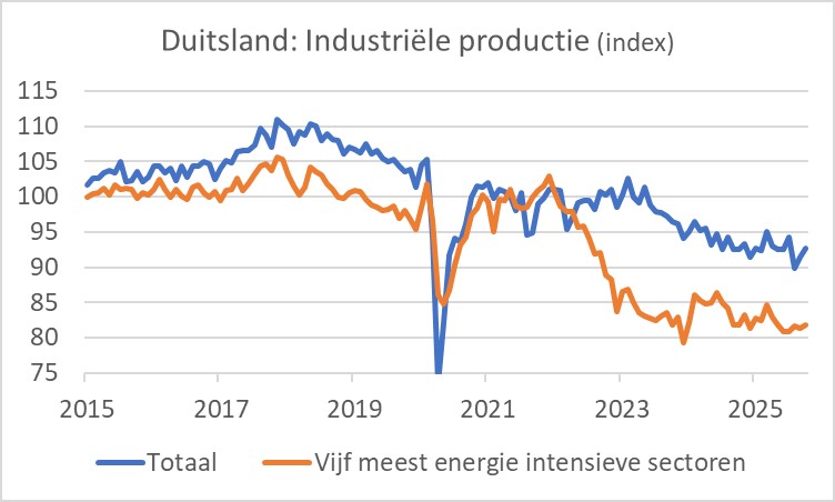 De Duitse industrie lijkt zich te stabiliseren. Het volume van de ontvangen orders nam in oktober met 1,5% toe ten opzichte van september toen al een 2% maand-op-maand stijging werd geboekt. Ook de productie is nu twee maanden achtereen toegenomen: +1,8% in oktober na 1,1% maand-op-maand in september. In de jaar-op-jaar vergelijking houdt het allemaal nog niet over. De volgende grafiek laat ook zien dat het met de productie in de energie-intensieve industrie bepaald nog niet wil vlotten ofschoon de Europese energieprijzen in de loop van dit jaar toch duidelijk zijn gedaald.