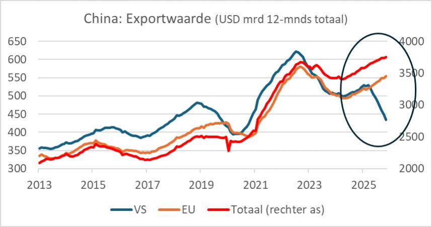 De Chinese exportwaarde (in USD) lag in juli 5,9% hoger dan een jaar eerder. Dat was beter dan verwacht en ook duidelijk beter dan de -1,1% uit oktober. De export naar de VS blijft fors dalen: -28,6% jaar-op-jaar. De Chinese export naar de EU lag juist 14,8% hoger dan een jaar eerder. De handelsoorlog van Trump heeft duidelijk effect op de Chinese export naar de VS, maar niet of nauwelijks op de totale Chinese export. Kennelijk slagen de Chinezen erin hun export te verplaatsen naar andere regio's. Mogelijk vinden Chinese goederen dan via andere landen alsnog hun weg naar de VS. Ook speelt een rol dat de export naar de VS slechts zo'n 10% van de totale Chinese export beslaat.