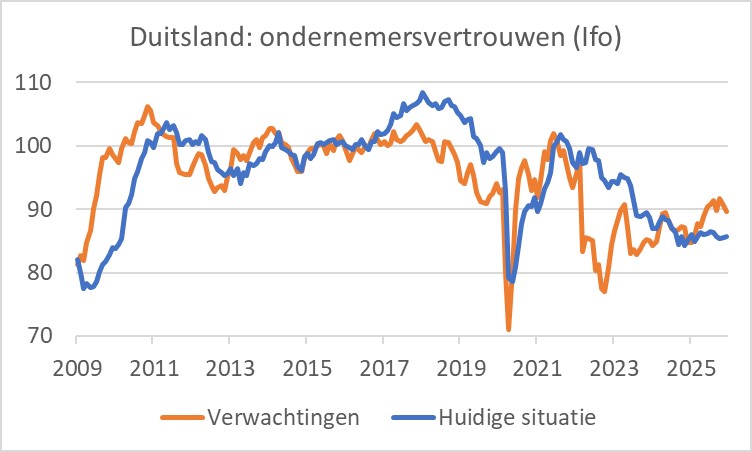 De ECB kijkt met genoegen naar economische groeicijfers van iets boven 1%. Maar Duitsland, de grootste economie in de eurozone, blijft kwakkelen. De toonaangevende Ifo-index die het ondernemersvertrouwen meet daalde van 88,0 in november naar 87,6 in december. De daling kwam volledig op conto van de verwachtingscomponent. Dit ging van 90,5 in november naar 89,7 in december, al was die sub-index de loop van dit jaar wel verbeterd. De onderstaande grafiek laat mooi zien dat het vertrouwen al enkele jaren structureel lager ligt dan in de periode 2011-2019.