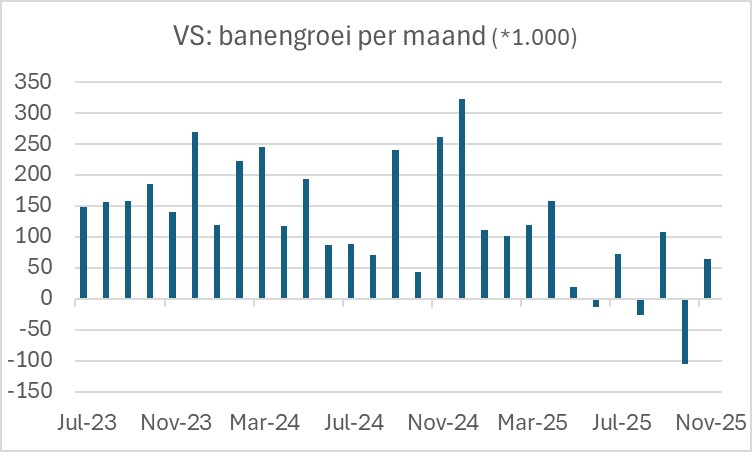 Nu de shutdown van de Amerikaanse overheid voorbij is, komt de publicatie van allerlei economische statistieken met horten en stoten weer op gang. Ik schrijf dit commentaar altijd op vrijdagochtend. De belangrijke cijfers over de banengroei in de VS worden altijd in de middag van de eerste vrijdag van de maand gepubliceerd. Daardoor kan ik er nooit aandacht aan besteden. Maar dit keer dus wel. Want de arbeidsmarktcijfers over oktober en november verschenen eerder deze week. In oktober gingen per saldo 105.000 banen verloren en in november nam het aantal weer toe met 64.000. De daling van het aantal banen in oktober werd veroorzaakt door een verlies van 157.000 banen bij de federale overheid, nog een uitvloeisel van initiatieven om het aantal ambtenaren terug te brengen door ze interessante voorwaarden aan te bieden om zelf te vertrekken. De werkgelegenheid in de private sector nam in beide maanden gematigd toe. Toch bevestigen de laatste cijfers dat de Amerikaanse arbeidsmarkt verzwakt, zij het bepaald niet alarmerend.