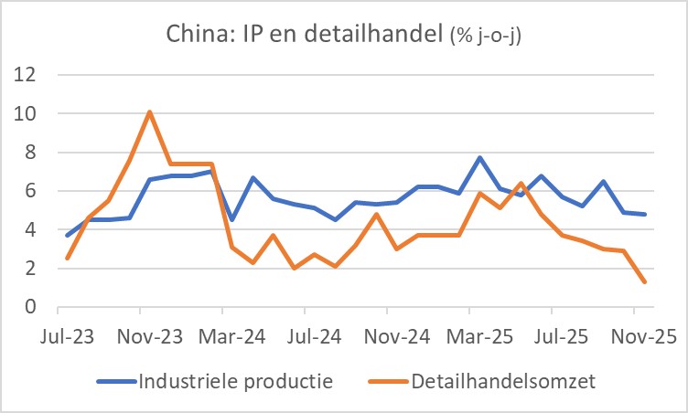 De cijfers die deze week werden gepubliceerd vertellen het hele verhaal. In november lagen de huizenprijzen 2,4% lager dan een jaar eerder. De huizenprijzen dalen al sinds augustus 2025. De productie in de industrie groeit wel. In november was het volume 4,8% hoger dan een jaar eerder, tegen 4,9% in oktober. Dat klinkt robuust, maar China heeft eigenlijk hogere groeicijfers nodig om de ambities op economisch gebied te realiseren. De groei van de detailhandelsomzet, tenslotte, was ronduit teleurstellend. Die lag in november een schamele 1,3% hoger dan een jaar eerder. In oktober was het 2,9%. Dat is natuurlijk veel te laag als de consument de groei moet gaan dragen en de ambitie is om de economie met 5% per jaar te laten groeien.
