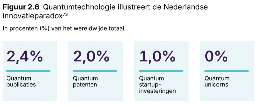 Misschien wel het meest interessante en zorgwekkende plaatje in het rapport heb ik hieronder ingeplakt. Het plaatje laat zien dat we op het specifieke gebied van quantumtechnologie internationaal heel behoorlijk ons partijtje meeblazen in termen van wetenschappelijk onderzoek en patenten, maar dat we ernstig tekortschieten in de vercommercialisering, daar waar de welvaart wordt gecreëerd. Wat voor quantumtechnologie geldt, geldt wellicht veel breder.