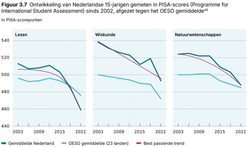 Op het gebied van talent onderschrijf ik volledig wat het rapport zegt. Een tweede plaatje uit het rapport dat ik met frustratie, woede en tranen in mijn ogen bekijk, heb ik hieronder ingeplakt. Wennink schrijft dat we sinds 2000 meer aan onderwijs uitgeven als percentage BBP, al onderbouwt hij dat niet. Hoe dan ook, onze onderwijsprestaties zijn verslechterd en verslechteren nog steeds, zowel in absolute zin, maar ook ten opzichte van andere landen. Toen de huidige regering wilde bezuinigen op onderwijs stak een storm van kritiek op. Maar over de verslechtering van onze onderwijsprestaties hoor je onthutsend weinig. Ik kan mij daar heel kwaad over maken. Wie legt daar eens verantwoording voor af? Belangrijker, hoe buigen we de trend om? Wennink zegt daar wel wat over, maar te weinig in mijn optiek.