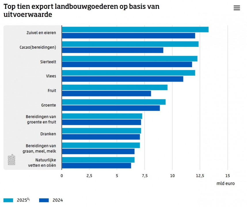 De waarde van de landbouwexport lag in 2025 op €137,5 miljard en was daarmee 8,4% hoger dan in 2024. Die stijging kwam wel voor een belangrijk deel door prijsstijgingen. Volgens het CBS verdienden we zo'n €43 milard aan de export van landbouwproducten van Nederlandse makelij. Dat is dus circa 4% van het bbp, zeker niet niks.