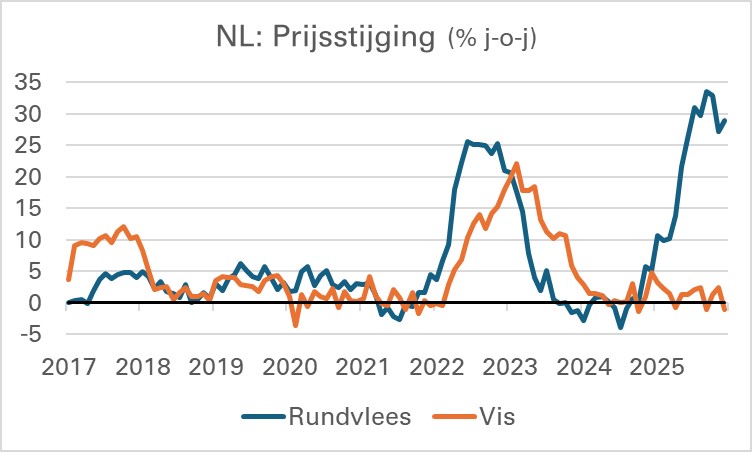 Je kunt beter thee drinken (prijzen in december 1,0% hoger dan een jaar eerder) dan koffie (+20,9%) en beter vis eten dan rundvlees (+28,9%). Melk was een stuk goedkoper dan een jaar eerder (-8,4%), maar eieren veel duurder (+9,1%). De premies voor autoverzekeringen blijven sterk stijgen: +12,6% jaar-op-jaar en wel +2,2% ten opzichte van november. Witgoed wordt snel goedkoper. Koel- en vrieskasten waren 8,3% goedkoper dan in december 2024 en (af)wasmachines en drogers zelfs 10,0%.