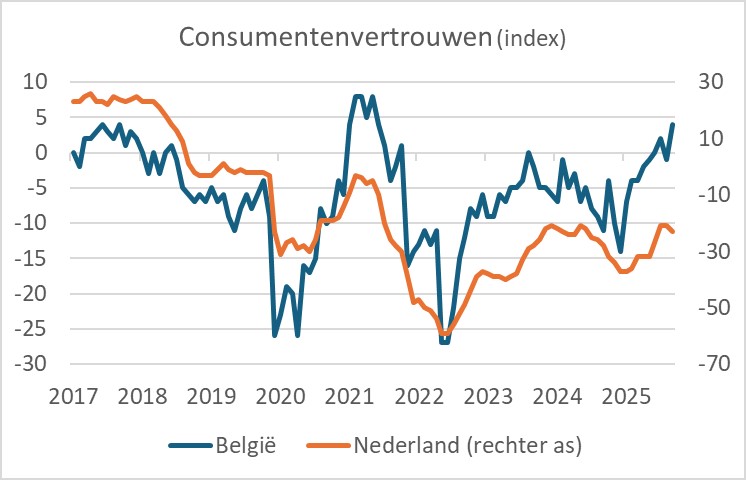 Opvallend is verder dat het consumentenvertrouwen in ons land ruim onder het langjarig gemiddelde ligt en in België juist ruim erboven. Zou de forse verbetering van het consumentenvertrouwen in België na april 2025 iets te maken kunnen hebben met Bart De Wever die sinds maart premier is? Je zou bijna zeggen: "Het kan wel."