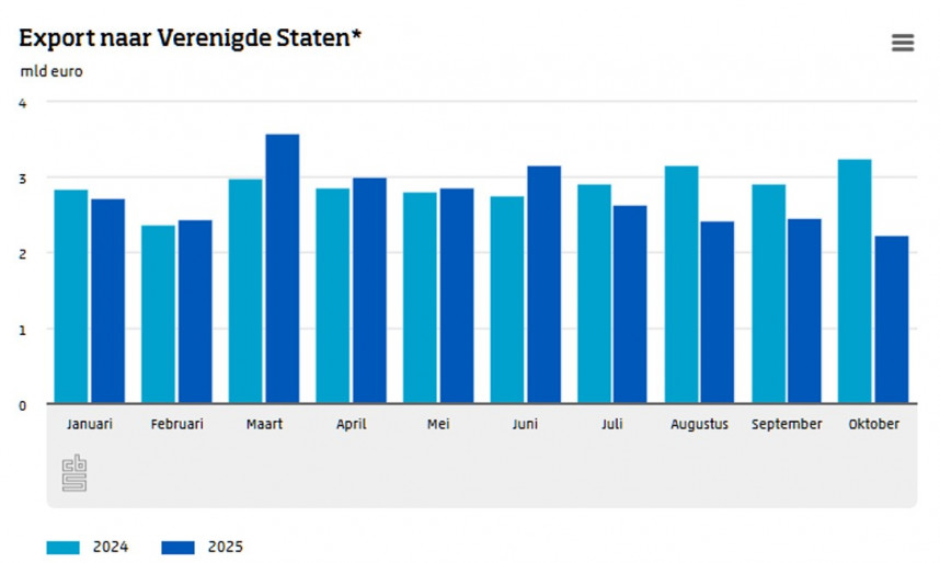 De Amerikaanse importheffingen beperken wat andere landen naar de VS exporteren. Volgens het CBS lag de waarde van onze uitvoer naar de VS in de eerste tien maanden van 2025 4,7% lager dan in 2024. Als slechts wordt gekeken naar goederen van Nederlandse makelij is de daling volgens het CBS 8%. Vanaf juli lag de maandelijkse waarde van onze export naar de VS lager dan in 2024. Deze cijfers verhullen misschien wat er gaande is. De daling van de uitvoerwaarde lijkt meer vaart te krijgen. We moeten bedenken dat de maandelijkse cijfers volatiel kunnen zijn. Maar in augustus, september en oktober samen was de uitvoerwaarde naar de VS 25% lager dan in 2024.