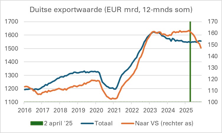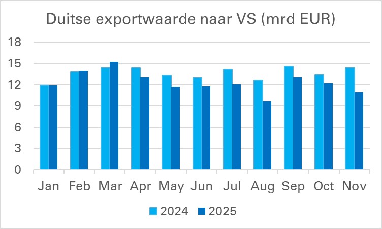 Het volgende plaatje laat zien dat de waarde van de Duitse export naar de VS vanaf 'Liberation Day' op 2 april vorig jaar in elke maand lager was dan in 2024. De Duitse statistici hebben de cijfers al tot en met november gepubliceerd. De Duitse uitvoerwaarde naar de VS lag in 2025 tot en met november 9,4% lager dan een jaar eerder. Om de vergelijking met Nederland zuiver te houden: over de eerst tien maanden was de daling 7,9%. Dat is dus min of meer hetzelfde als onze 8% wat betreft producten van Nederlandse makelij.