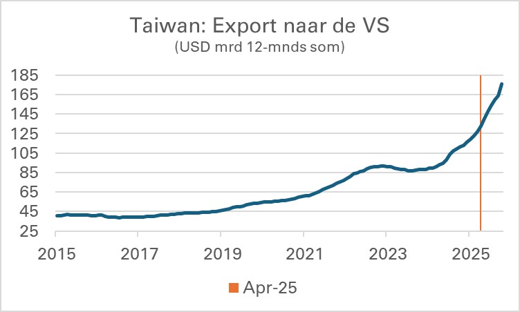 Onze export naar de VS neemt af, maar daarin zijn we niet de enige. Taiwan exporteert juist veel meer naar de VS. Dat heeft ongetwijfeld vooral met AI te maken.