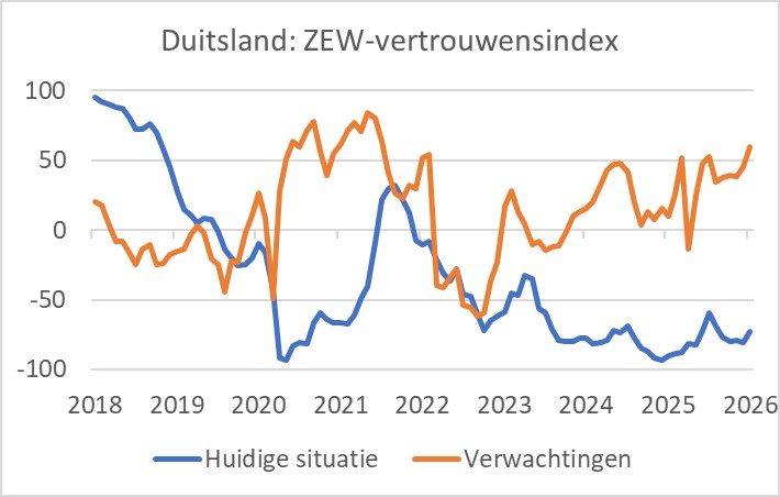 De directe toekomst voor de Duitse economie begint wat op te klaren. Twee weken geleden kon ik melden dat de orders bij Duitse industriële ondernemingen in de drie maanden tot en met november duidelijk zijn gestegen. Deze week bleek de stemming onder analisten verder te verbeteren. De verwachtingencomponent van de ZEW-index steeg van 45,8 in december tot 59,6 in januari. De index voor de taxatie van de huidige situatie verbeterde ook: van -81,0 in december tot -72,7 in januari.