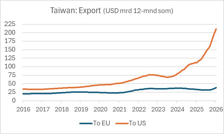 Hoe kan het Amerikaanse tekort in de goederenhandel dan toch zijn toegenomen? Dat heeft mijns inziens alles te maken met de ongekende AI-boom in de VS. De import van alles wat met AI te maken heeft, is spectaculair gegroeid. Het voor ons, Europeanen, verontrustende is dat we dat niet of veel minder zien in Europa. Het duidelijkst komt dit tot uitdrukking in de Taiwanese export. Die is sterk geconcentreerd in halfgeleiders en die zijn weer nodig voor AI. De eerste grafiek spreekt boekdelen. Toegegeven, de Taiwanese export naar de EU groeit hard, maar is veel kleiner dan die naar de VS. Het bilaterale handelstekort van de VS met Taiwan is toegenomen van $74 miljard in 2024 naar $147 miljard in 2025. Tussen 2002 en 2018 schommelde dat tekort jaarlijks tussen $10 miljard en $15 miljard. Het gaat hier om waardes, dus inclusief prijsstijgingen, maar in volumes is het beeld ongetwijfeld ook spectaculair.