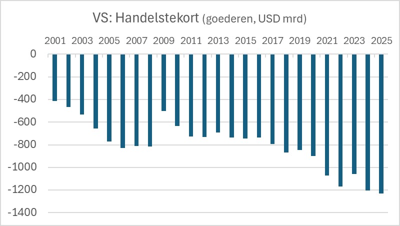 Ondanks de importheffingen van Donald Trump is het tekort dat de Amerikanen boeken in de internationale goederenhandel in 2025 toegenomen. Misschien is dat een teken dat die heffingen minder invloed op de handel hebben dan je zou denken. Helemaal zonder effect zijn die heffingen trouwens bepaald niet. Het enorme tekort dat de VS boekt in de bilaterale handel met China is in 2025 met ongeveer een derde gedaald ten opzichte van 2024. Ten opzichte van 2018 is het Amerikaanse tekort ten opzichte van China meer dan gehalveerd, al is het waarschijnlijk dat veel Chinese goederen de Amerikaanse markt alsnog bereiken, maar met een omweg. Dit laat ik nu maar even rusten. Dat heffingen effectief kunnen zijn, blijkt ook uit het feit dat de Amerikaanse import van auto's in 2025 fors is teruggevallen.