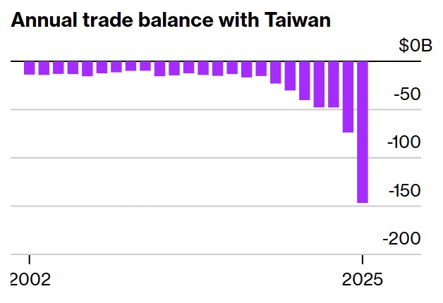 De volgende twee staafdiagrammen gaan over de handel tussen de VS enerzijds en China, respectievelijk Taiwan anderzijds. Ik heb ze van Bloomberg geplukt.