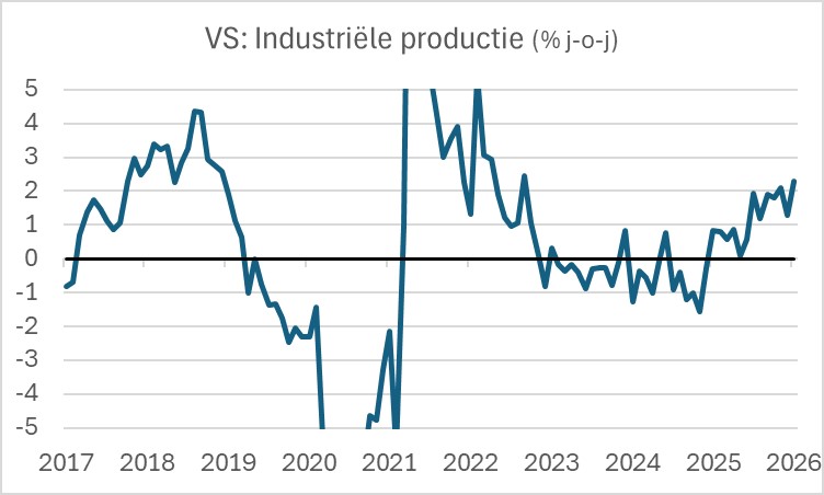 De verbetering van de Amerikaanse conjunctuur is overigens goed te zien in de ontwikkeling van de productie in de verwerkende industrie. Inmiddels is de groei van de productie gestegen tot boven 2%. De laatste keer dat de groeivoet van de productie in de verwerkende industrie in de VS boven 2% lag, is alweer een paar jaar geleden. Trump zal het wel claimen als een succes van zijn beleid.