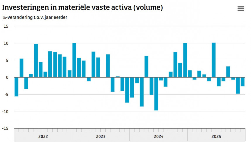Het CBS publiceerde vandaag cijfers over de investeringen in materiële vaste activa in ons land. Niet echt om vrolijk van te worden. In december lag het volume 2,6% lager dan een jaar eerder, ofschoon december 2025 een werkdag meer had dan december 2024. Het CBS schrijft: "Er is vooral minder geïnvesteerd in overig wegvervoer (vrachtauto's, opleggers, busjes, etc.) en vliegtuigen. De investeringen in personenauto's, gebouwen, machines (waaronder defensiematerieel) en infrastructuur waren echter groter dan in december 2024." Waarvan akte.
