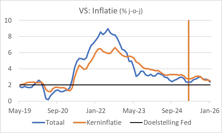 We wisten al dat de inflatie in de eurozone in januari is teruggevallen naar 1,7% en in Nederland naar 2,4%. Op de Europese inflatiemaatstaf, HICP, bedroeg onze inflatie zelfs slechts 2,2% in januari. In de VS daalde de inflatie van 2,7% in december naar 2,4% in januari. Dat is dus duidelijk hoger dan in de eurozone en ook boven de doelstelling van de Fed. Maar het is toch veel minder dan gevreesd en door veel economen voorspeld toen Trump zijn importheffingen afkondigde. Amerikaanse cijferaars proberen de effecten van die heffingen uit de cijfers te filteren en komen dan tot de conclusie dat de inflatie aan de doelstelling van de Fed voldoet. Die effecten van de heffingen zijn tijdelijk. In de volgende grafiek heb ik een verticale lijn getrokken in april vorig jaar toen Trump zijn heffingen aankondigde. De inflatie verhogende werking is tot dusver sterk meegevallen. Een paar bevriende Amerikaanse economen voorspellen dat die inflatie verhogende effecten nog moeten komen. Misschien hebben ze gelijk. Maar ik vermoed dat ze een klassieke fout maken die ik ook vaak heb gemaakt. Als je voorspelling niet uitkomt, betoog je dat de cijfers niet kloppen of dat je alsnog gelijk gaat krijgen in de naaste toekomst. Meestal is dat een vergissing…
