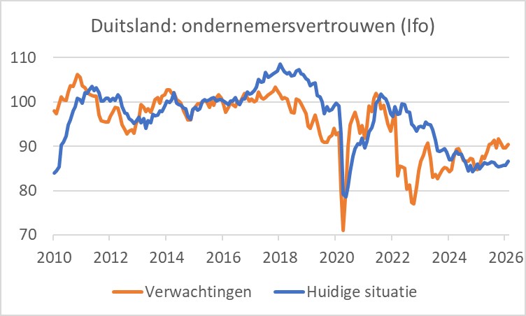 De laatste tijd lijkt de Europese conjunctuur wat aan te trekken. Dat is in lijn met de wereldhandel. Vooral de ontwikkelingen rondom AI spelen hierbij een rol. Daarnaast zal expansief begrotingsbeleid, vooral in Duitsland, voor een verdere impuls zorgen. De Duitse Ifo-index, die het vertrouwen van ondernemers meet, verbeterde in februari: 88,6 tegen 87,6 in januari. Zowel de verwachtingencomponent als de index voor de beoordeling van de huidige situatie verbeterde. De laatste sub-index steeg zelfs voor de vierde maand op rij, al is die stijging tergend langzaam.