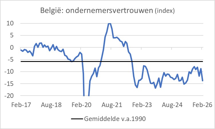 Het vertrouwen van de Belgische ondernemers verzwakte juist behoorlijk in februari. De Nationale Bank van België rapporteerde dat de index van het vertrouwen van ondernemers in alle sectoren is gedaald van -8,8 in januari naar -13,7 in februari. Vooral industriële ondernemers waren in februari somberder dan in januari: -17,1 in februari na -11.0 in januari. Belgische industriële ondernemers klaagden vooral over een verminderde orderontvangst. Er wordt wel betoogd dat de industriële structuur van België 'vroeg-cyclisch' is waardoor de ontwikkeling van het Belgische ondernemersvertrouwen indiceert waar het in de rest van Europa naartoe zal gaan. Of dat dit keer ook zo is, moeten we afwachten.