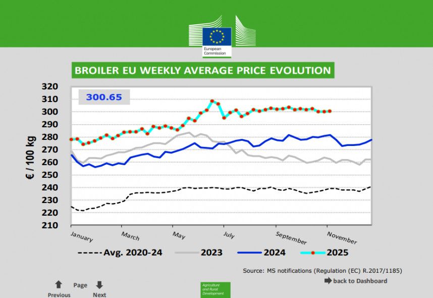 In Noord-Europa was er tot week 45 nog sprake van enige prijsdruk. Ondanks de vogelgriep, die dit jaar op grote schaal pluimveebedrijven treft, is het aanbod wat sterker. Dit is het gevolg van het herstel van het Poolse aanbod, waardoor er meer concurrentie is op de Noord-Europese markt. Ondanks vrij zware verliezen zijn de prijzen in het Oost-Europese land fors onder druk komen te staan. Daarnaast is de seizoensmatige vraag in de winter bijna altijd zwakker. Als het kouder wordt, daalt de vraag naar kip vrijwel altijd wat, ten gunste van varkens- en rundvlees.