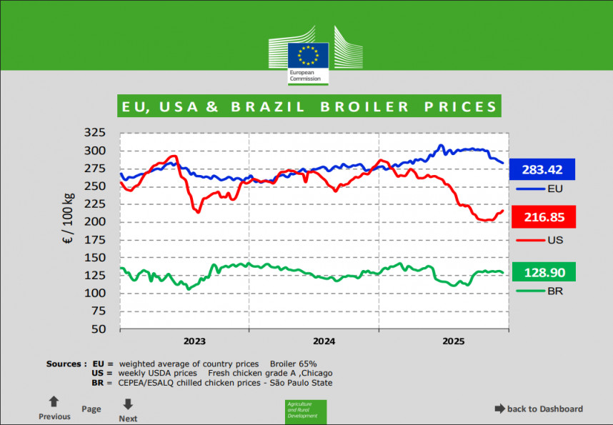 De Europese pluimveevleesprijs is aan het einde van 2025 gedaald, zo blijkt uit het wekelijkse dashboard van de Europese Unie. Gemiddeld daalde de prijs ten opzichte van de maand ervoor met 2,3% tot €283,42 per 100 kilo. Opmerkelijk is dat de pluimveevleesprijs, die het hele jaar op een hoog niveau lag, nu lager is dan een jaar eerder. Vergeleken met dezelfde periode een jaar geleden is de prijs met 0,7% gedaald.